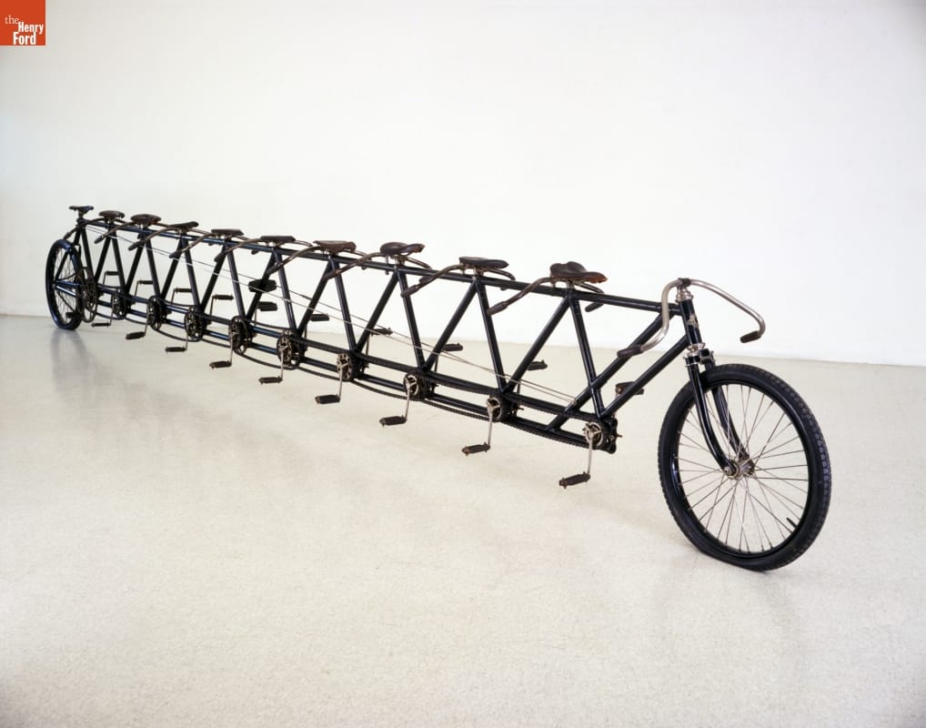 Charles Metz of Waltham, Massachusetts, built the Orient Oriten in 1896 as a way to promote his Orient line of bicycles. Metz featured this 23-foot-long, 305-pound ten-seater at bicycle meets and races throughout the country. Though difficult to ride, the vehicle could reach speeds of 45 miles per hour. The Henry Ford owns the only surviving Oriten.