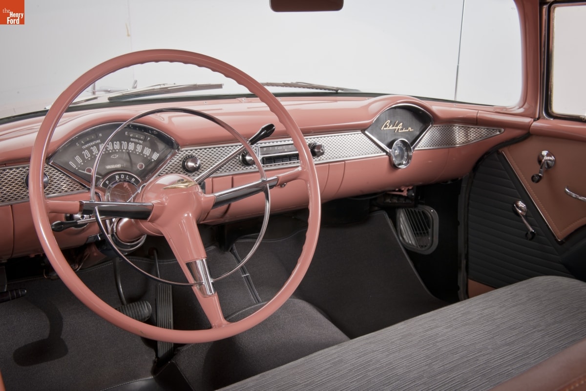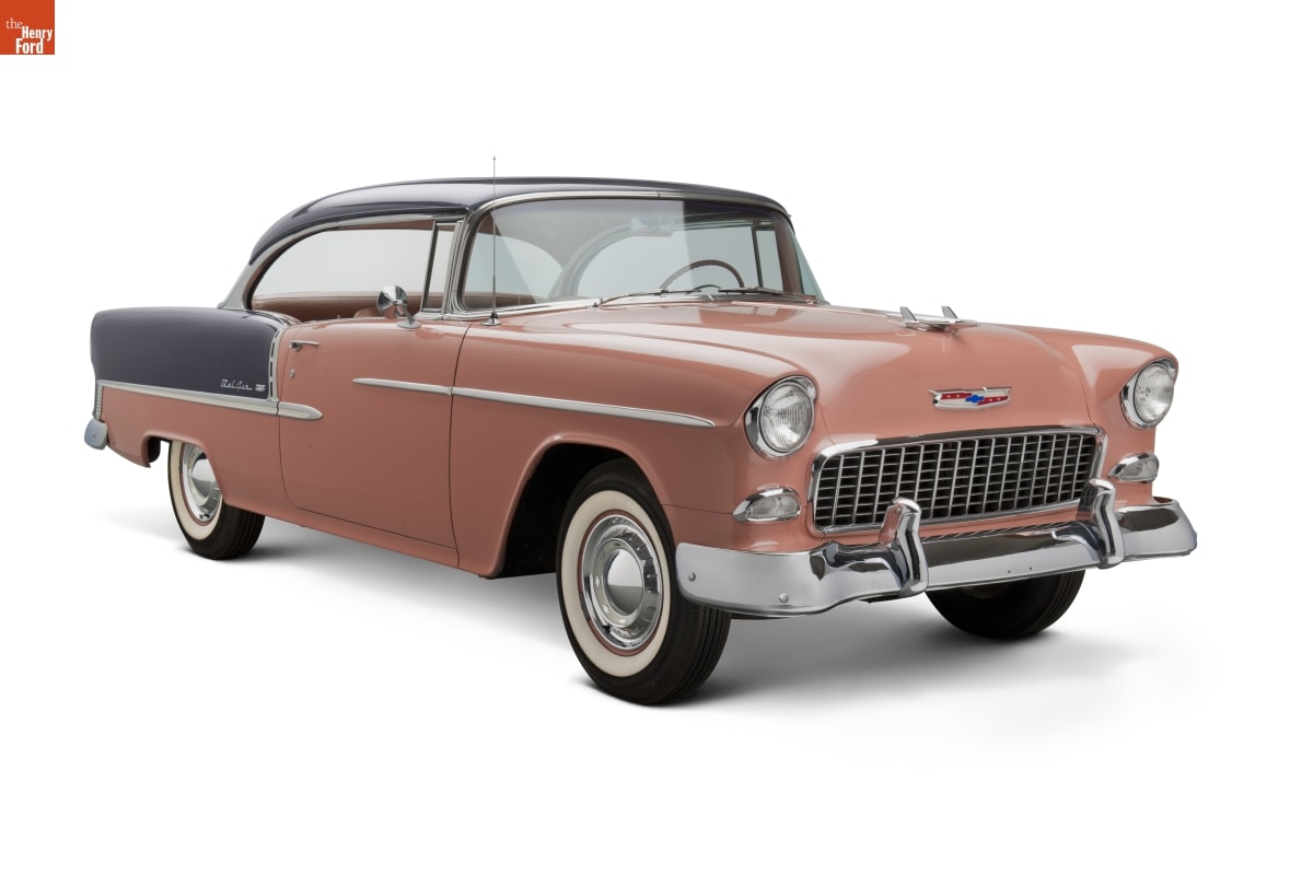 Chevrolet turned its image around in 1955. Its new V-8 engine was light modern, powerful and reliable. Combined with a clean, classic new body style it changed customers' impression of Chevrolet from stodgy and conservative to sporty and youthful almost overnight. This car, in fashionable coral and smoke grey colors, epitomizes Chevy's new slogan, "The Hot One."