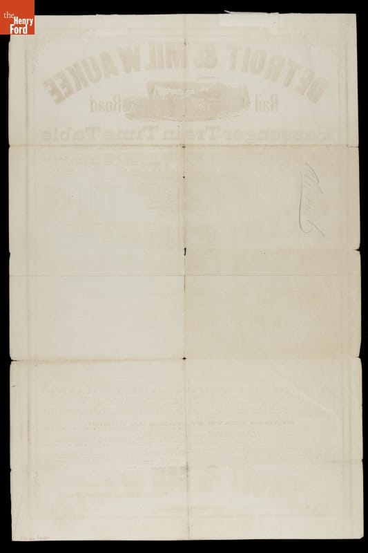 Captioned: DETROIT & MILWAUKEE / Rail Road / Passenger Train Time Table / TO TAKE EFFECT ON WEDNESDAY, APRIL 28th, 1869 for service between Detroit and Milwaukee. Below: Detroit & Milwaukee Railroad Office, / DETROIT, APRIL 28, 1869. // THOS. BELL, General Sup't. / Free Press Printing Company, Corner Woodbridge and Griswold Streets, Detroit.