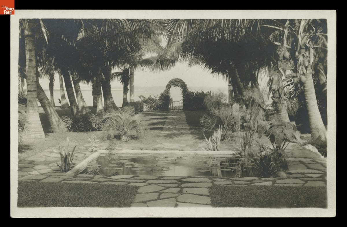 This is the view from Henry and Clara Ford's vacation home along the Caloosahatchee River in Fort Myers, Florida. Ford purchased the property, which neighbored his friend Thomas Edison's winter retreat, in 1916. The Fords named the estate "The Mangoes" and surrounded their newly built bungalow with tropical landscaping, including citrus trees and the palms and pond seen here.
