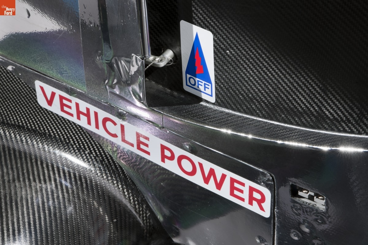 Printed above windshield, in black: EDISON2 Printed on hood: PROGRESSIVE / AUTOMOBILE / X / PRIZE / EDISON2 Printed above side windows: (image of italian flag E. PIRRO / (image of american flag) B. JAEGER Printed on middle sides: PROGRESSIVE / AUTOMOBILE / X / PRIZE / CISCO Printed on rear left side: EDISON2 / EMCO GEARS / NCCAR / 98 / BORG WARNER TURBO SYSTEMS Printed in rear right side: EDISON2 / EMCO GEARS / NCCAR / 98 / BORG WARNER TURBO SYSTEMS / VEHICLE POWER