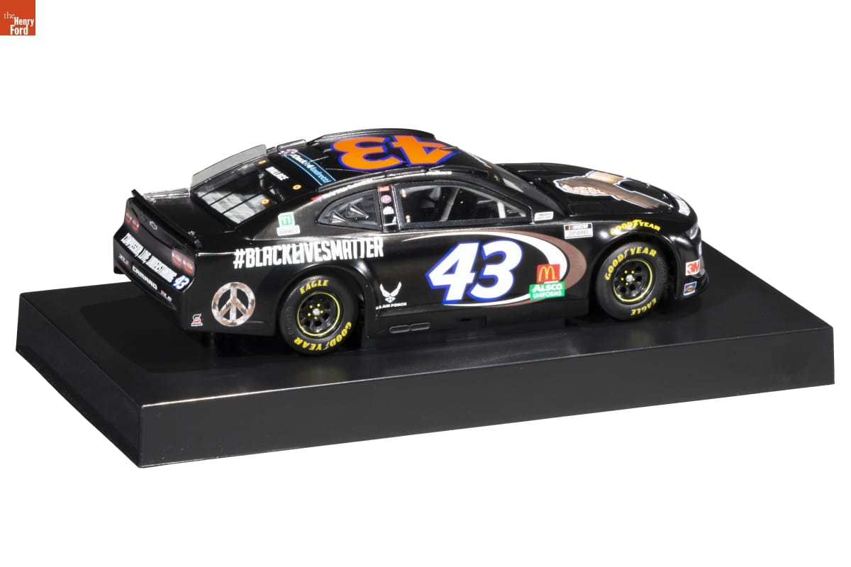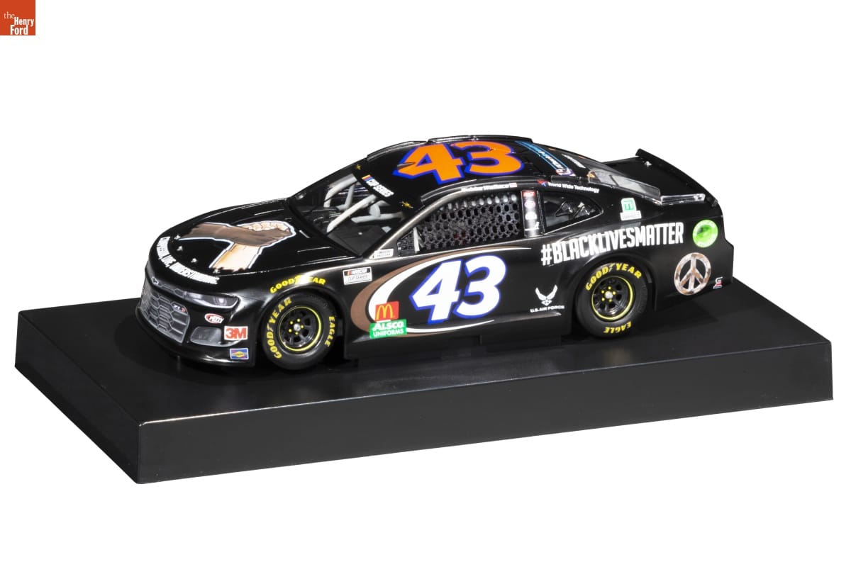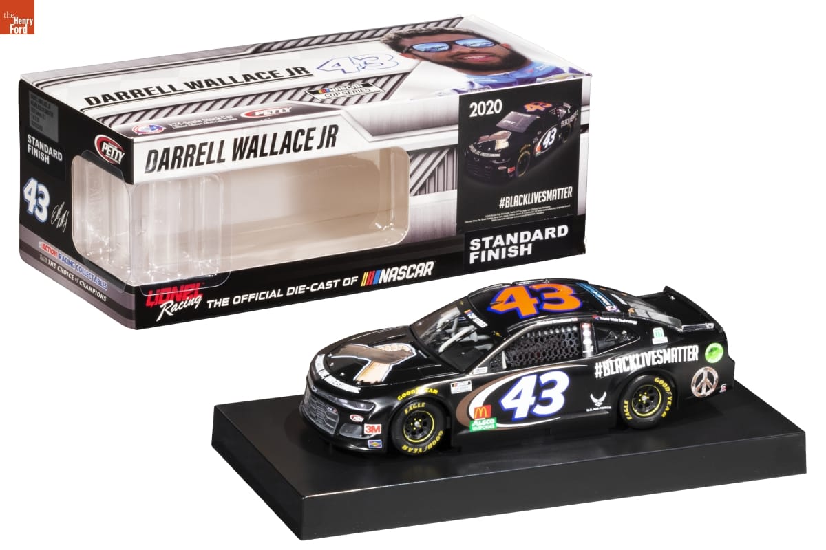 on sides of model: #BLACKLIVESMATTER on top and sides of model: 43 on front of packaging: DARRELL WALLACE JR / 2020 #BLACKLIVESMATTER / (C) Richard Petty Motorsports. The No. 43 is a trademark of Richard Petty Motorsports. / Chevrolet, Chevy, The "Bowtie" Emblem, Monte Carlo, Impala, Camaro, Camara ZL1, Camaro ZL1 1LE emblems and vehicle body designs are General / Motors Trademarks used under license to Lionel(R) NASCAR(R) Collectables. / LiONEL / Racing / THE OFFICIAL DIE-CAST OF NASCAR / STANDARD / FINISH on left side of packaging: AUTHENTIC RACING COLLECTIBLE / '20 / Be sure to register your car's DIN at / WWW.LIONELGARAGE.COM / ACTION RACING / A / COLLECTABLES / ACTION RACING COLLECTABLES / Still THE CHOICE of CHAMPIONS on back of packaging: DARRELL WALLACE JR / 43 / RICHARD / PETTY / MOTORSPORTS / LiONEL / Racing / THE OFFICIAL DIE-CAST OF NASCAR / 1:24-Scale Stock Car / Limited Edition Adult Collectable sticker on right side of packaging: DARREL WALLACE JR / #43 #BLACKLIVESMATTER / 2020 Camaro ZL1 / 1 OF 3120 / C432023LVDX on right side of packaging: RICHARD / PETTY / MOTORSPORTS / STANDARD / FINISH / 43 / ACTION RACING COLLECTIBLES / Still THE CHOICE of CHAMPIONS on top of packaging: DARRELL WALLACE JR 43 / NASCAR / CUP SERIES / ACTION RACING / A / COLLECTABLES / 1:24-Scale Stock Car / Limited Edition Adult Collectable / RICHARD / PETTY / MOTORSPORTS on bottom of packaging: WWW.LIONELRACING.COM / ADULT COLLECTABLE / All drivers' names, likenesses, signatures and other trademarks are used under license or with permission. / (C) 2020 Richard Petty Motorsports. The No. 43 is a trademark of Richard Petty Motorsports. (C) 2020 U.S. Air Force. All rights reserved. / (C) Victory Junction, Inc. All Rights Reserved. 2020 (C) 2020 World Wide Technology All Rights Reserved. / Chevrolet, Chevy, The "Bowtie" Emblem, Monte Carlo, Impala, Camaro, Camara ZL1, Camaro ZL1 1LE emblems and vehicle body designs are General Motors / Trademarks used under license to Lionel(R) NASCAR(R) Collectables. NASCAR(R) is a registered trademark of The National Association for Stock Car Auto / Racing, Inc. GOODYEAR is a trademark of The Goodyear Tire & Rubber Company used under license. Lionel(R) NASCAR(R) Collectables, ACTION RACING / COLLECTABLES(R), and all associated logos are trademarks of Lionel(R) NASCAR(R) Collectables. RACING COLLECTABLES OF AMERICA, RCCA, and all / associated logos are trademarks owned by Racing Collectables Club of America, Inc. Lionel(R) Racing does not warrant that this adult collectible is authentic in / every detail. Every reasonable effort is made to ensure authenticity. However, many factors including changes in a driver's racing team, sponsors or / manufacturing limitations may cause inaccuracies. The listed production number is merely an estimate of the intended production. Manufacturing processes and / unpredictable scrap rates may cause the actual production number to fall short or exceed the estimated production number. Manufactured by Lionel, L.L.C. / 6301 Performance Dr, Concord, NC 28027. Lionel Racing(R)2020. Lionel(R) NASCAR(R) Collectables. Lionel Racing is a registered trademark of Lionel, L.L.C. / Lionel Racing and NASCAR are registered trademarks of their respective owners, all rights reserved. MADE IN CHINA. / LiONEL / Racing / RCCA / ELITE / To join the / RACING COLLECTABLES / CLUBS OF AMERICA / call 1-800-952-0708 / GM / OFFICIAL / LICENSED PRODUCT / 99-41212-49359 / OFFICIALLY / LICENSED / PRODUCT / HAND / CRAFTED / IN / CHINA