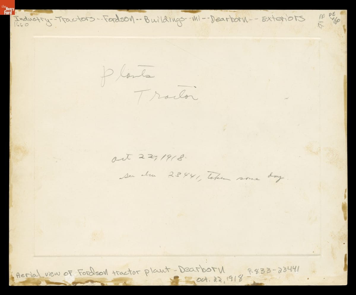 Plants | Tractor | Oct 22, 1918 | see also 23441, taken same day | Aerial view of Fordson tractor plant - Dearborn | Oct. 22, 1918