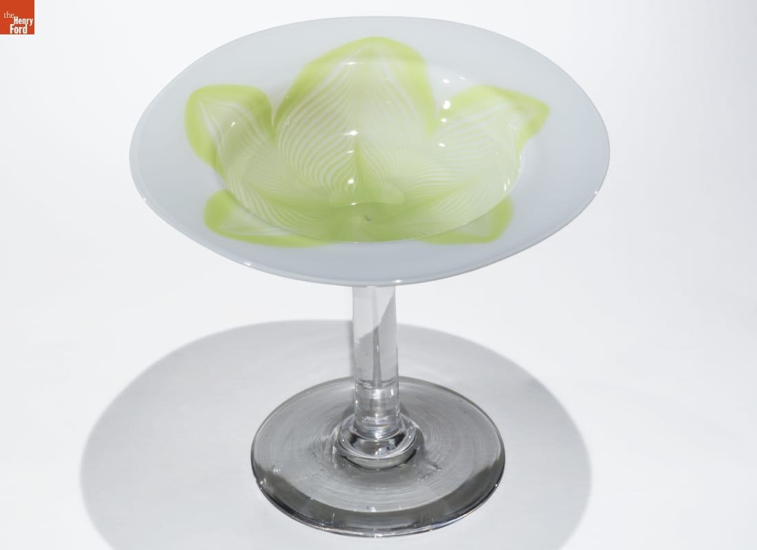 Flying in the face of economics at the beginning of the Great Depression in 1932, the Libbey Glass Company of Toledo decided to create a new line of high-end glassware. The company hired Arthur Douglas Nash from Louis Comfort Tiffany's staff to oversee the line. Called the "New Era" Nash's limited-production line combined traditional designs like the Tiffany-derived botanical motifs seen in this piece with contemporary 1930s designs.