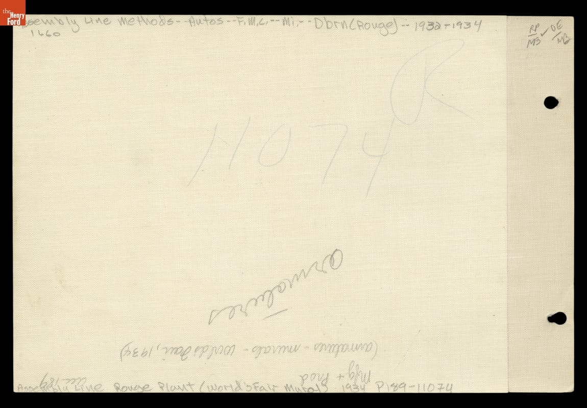 The Ford building at the 1933-1934 Chicago World's Fair was lined with photomurals depicting Ford Motor Company's River Rouge Complex, the largest, most efficient manufacturing complex of its time. The murals were enlargements of photographs taken by George Ebling, Ford's chief photographer for the exposition. His depictions of modern industrial production exemplified the fair's Century of Progress theme.