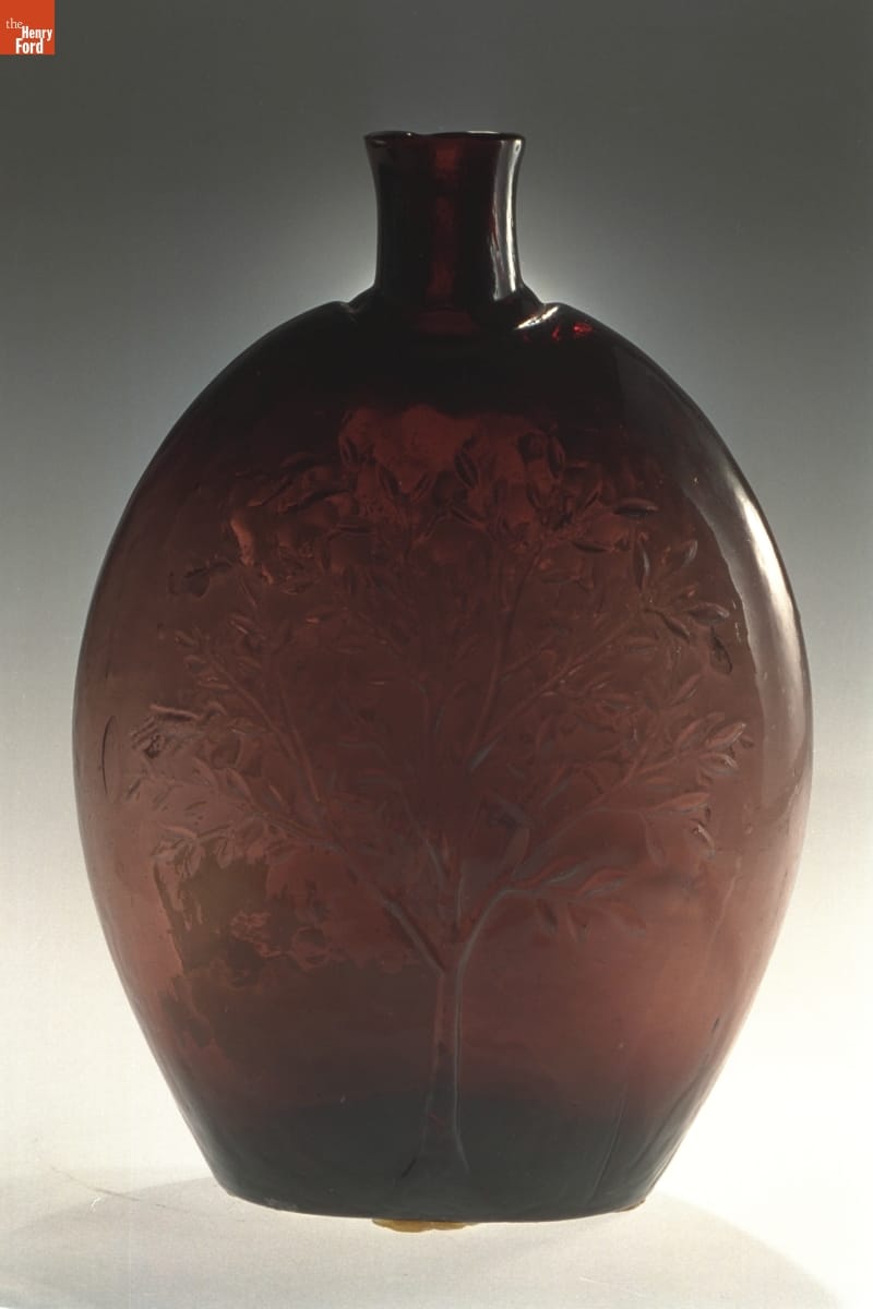 Glass factories in America began producing inexpensive, mold-formed flasks in the early 1800s. These figured flasks, often decorated with symbols of national pride or political or cultural affiliation, appealed to America's common man. Other images, like the tree, may have been purely decorative. Variation of this design include a tree in bloom (summer) and a tree without leaves (winter).