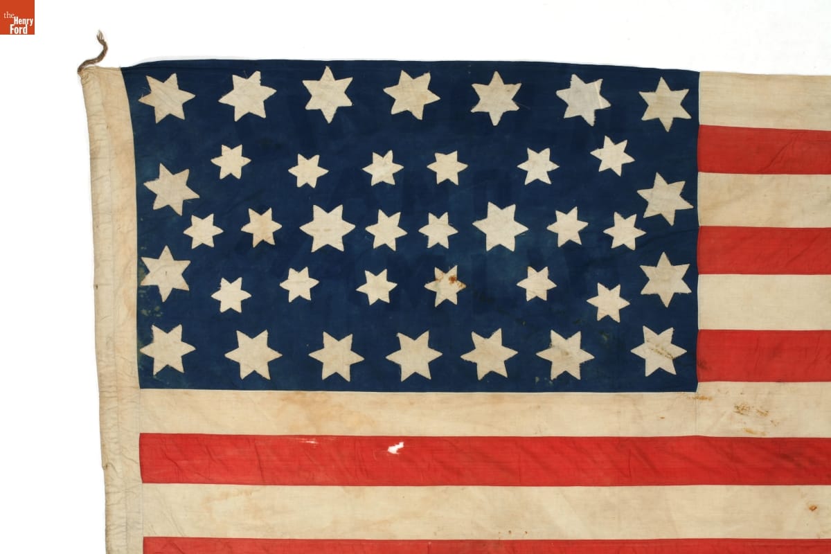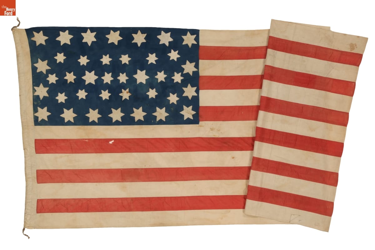 This flag was handmade by Lucinda McGrath of Fayette County, Indiana. Her husband, John, carried it in parades supporting Republican candidates Abraham Lincoln and Hannibal Hamlin in the 1860 presidential election. In 1865, McGrath--carrying this flag--led a group of mourners to meet Lincoln's funeral train as it passed through Indiana en route to its final stop in Springfield, Illinois.