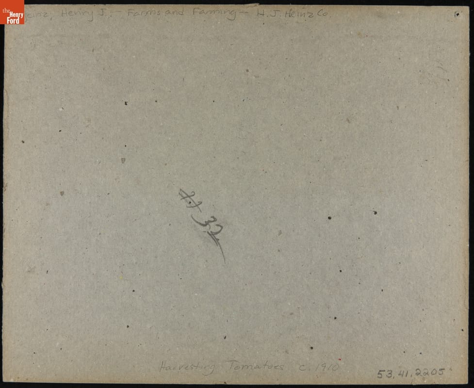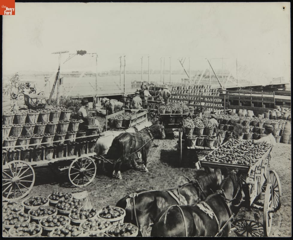Entrepreneur H.J. Heinz recognized that producing high-quality products began with growing the best ingredients. He managed every aspect of the process from seed selection through harvest to ensure that only the best ingredients became Heinz pickled foods, preserves, and condiments. This photograph shows the care taken with tomatoes, packed into baskets, hauled to a packing station, and awaiting transport to a processing facility.