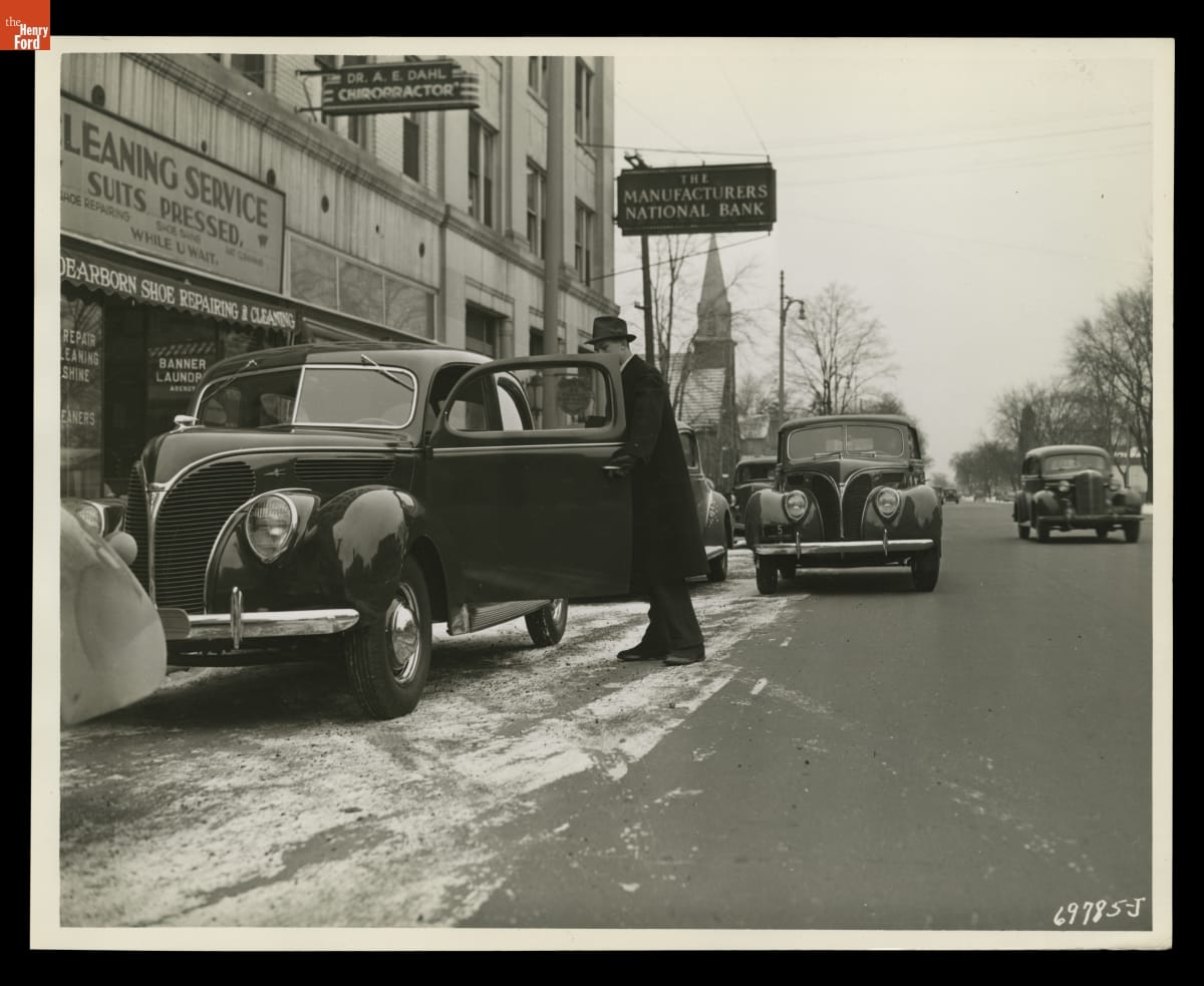 Man Standing beside a Ford V-8 DeLuxe Tudor Car Parked on a Commercial Street, Dearborn, Michigan, January 1938