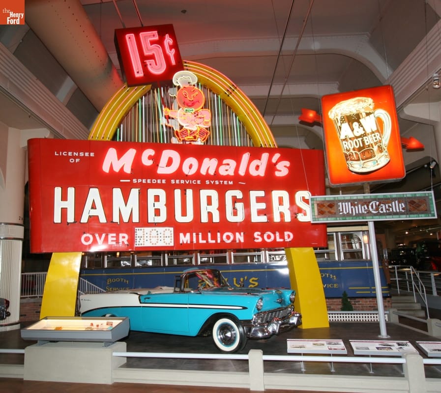 In 1948, the McDonald brothers transformed their Southern California drive-in restaurant with their radical new "Speedee Service System"--assembly-line production of a limited menu at drastically reduced prices. Richard McDonald created this sign design in 1952. In 1955, milkshake machine salesman Ray Kroc franchised the McDonald's concept--prompting numerous imitators and ultimately turning America into a "fast food nation."