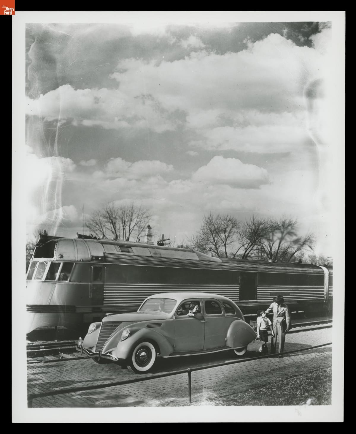 1936 Lincoln Zephyr Sedan Parked near a Locomotive