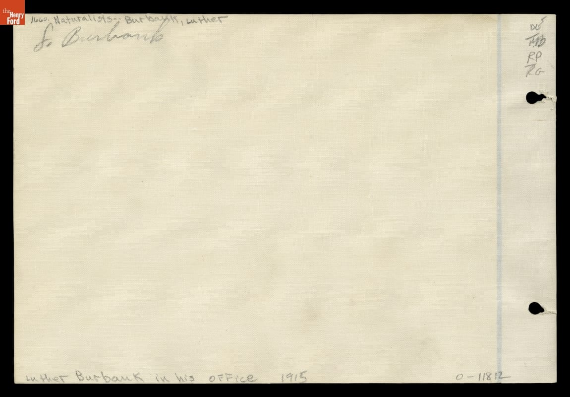 Luther Burbank (1849-1926), an American plant breeder, naturalist, and author, was especially noted for his experiments with plants, fruits, and vegetables. After developing the influential Russet Burbank potato in his native Massachusetts, Burbank established a large experimental garden in Santa Rosa, California. When not working outdoors, Burbank spent time carrying on his nursery business, keeping accounts, researching, and writing.