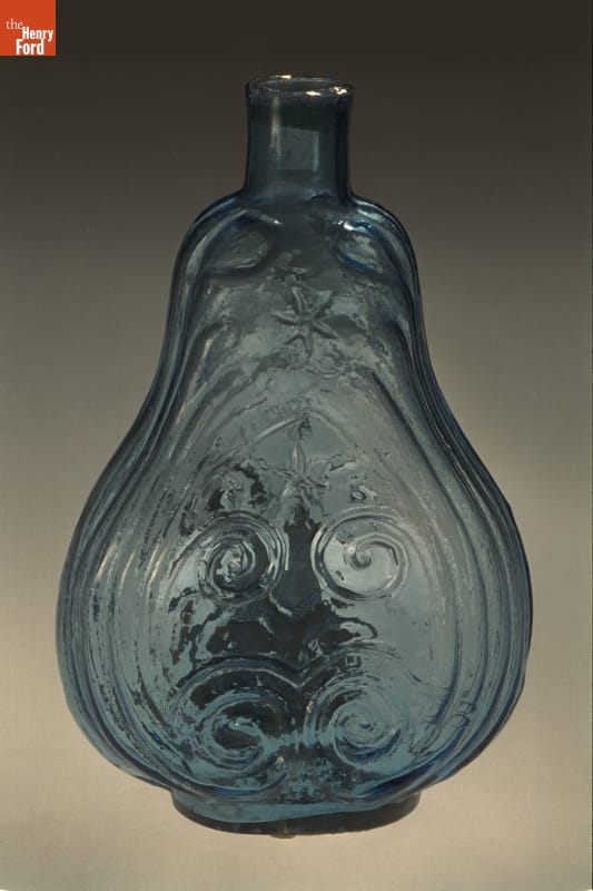 Glass factories in America began producing inexpensive, mold-formed flasks in the early 1800s. These figured flasks appealed to America's common man. Many of these flasks contained symbols of national pride or political or cultural affiliation. Embellishments on other flasks, like this one, were purely decorative.