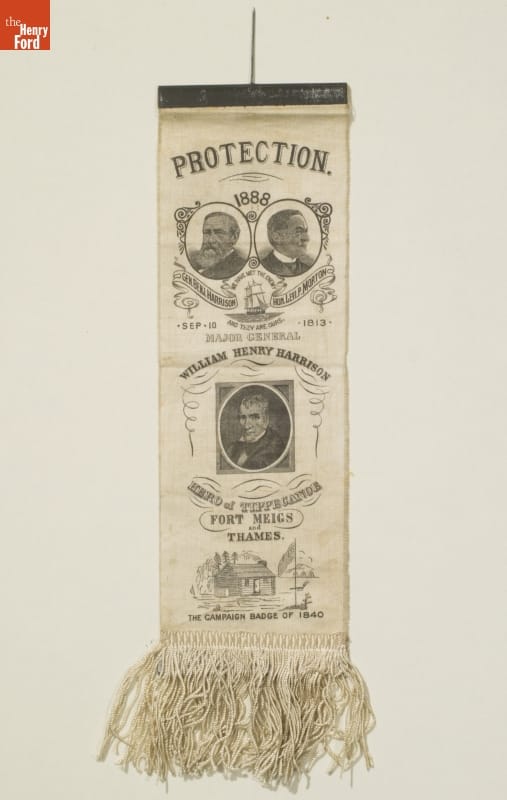Front PROTECTION / 1888 / GEN. BENJ. HARRISON HON. LEVI. P. MORTON / WE HAVE MET THE ENEMY / AND THEY ARE OURS. / .SEP. 10. 1813 . / MAJOR GENERAL / WILLIAM HENRY HARRISON / HERO OF TIPPECANOE / FORT MEIGS / AND THAMES / THE CAMPAIGN BADGE OF 1840