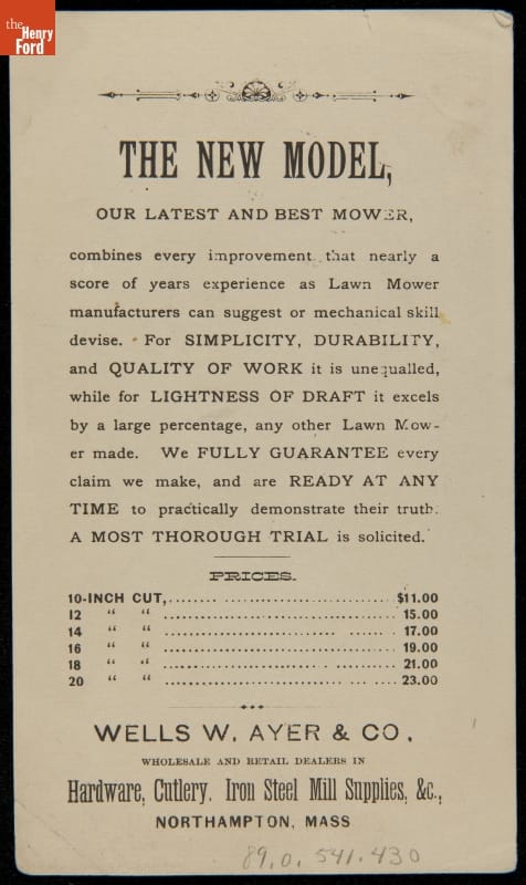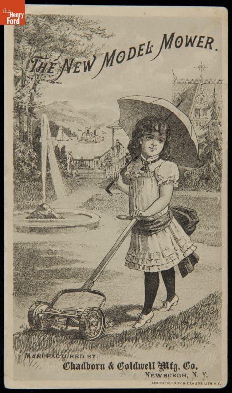 In the late 1800s, improved transit allowed suburbs to grow around cities. Well-kept lawns were a key feature of a suburban home, and the lawn mower was an essential tool. Early mowers were often heavy and hard to push, though this trade card suggests that using the "New Model Mower" was like a walk in the park.