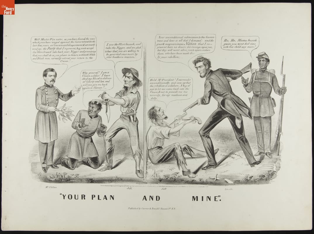 below picture: Entered according to act of Congress AD 1864, by Currier & Ives, in the Clerk's Office of the District Court of the United States for the Southern District of N.Y. / McClellan Jeff Jeff Lincoln at bottom: "YOUR PLAN AND MINE." / Published by Currier & Ives, 152 Nassau S. N.Y.