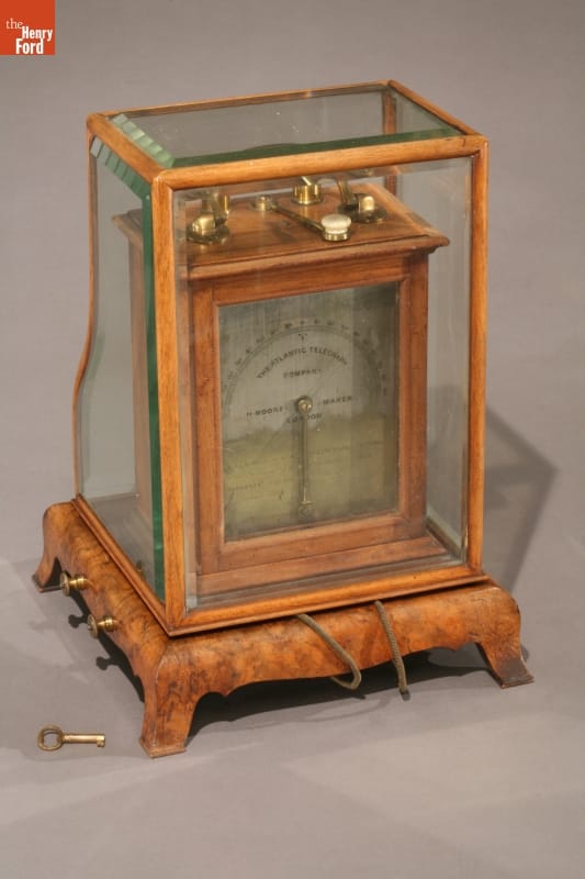 Inscribed on the silver-plated portion of the face of the instrument: THE ATLANTIC TELEGRAPH / COMPANY / H. MOORE MAKER / LONDON Inscribed on the face in area stripped of silver plating: THE MESSAGE FROM HER MAJESTY QUEEN VICTORIA TO THE PRESIDENT OF THE UNITED STATES (JAMES BUCHANAN) WAS RECEIVED ON THIS INSTRUMENT IN AUGUST 1858 Inscribed in the brass on verso of instrument: Upon this GALVANOMETER nearly the whole of the messages sent from VALENTIA through the ATLANTIC CABLE to NEWFOUNDLAND were received, and were read there on at Newfoundland in August and September 1858, Mr J.C. Laws being the Company's Electrician in Newsfoundland and Mr. George Saward being the Secretary to the Company at that date. Inscribed plate on underside of case: Bonded U.S. Customs/ Detroit Entry/ Permanant Exhibition #1 / Jan. 16 1934 / Edison Institute