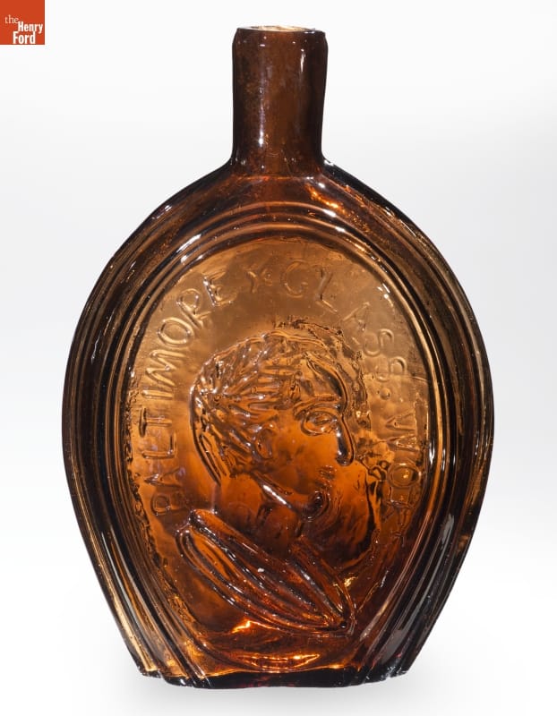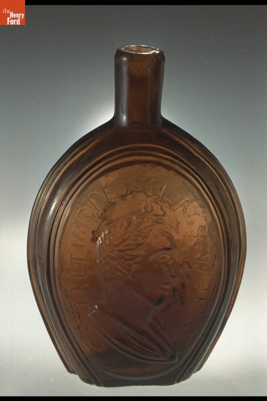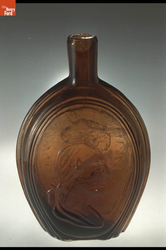Whether depicted as commander-in-chief of the Continental Army, the first president of the United States, or a symbol of the republic, George Washington is a common likeness on early American flasks. Washington appears on 72 recorded flask designs--more than any other person. This example shows Washington with later politician, Henry Clay. Both are depicted as classical statesmen.