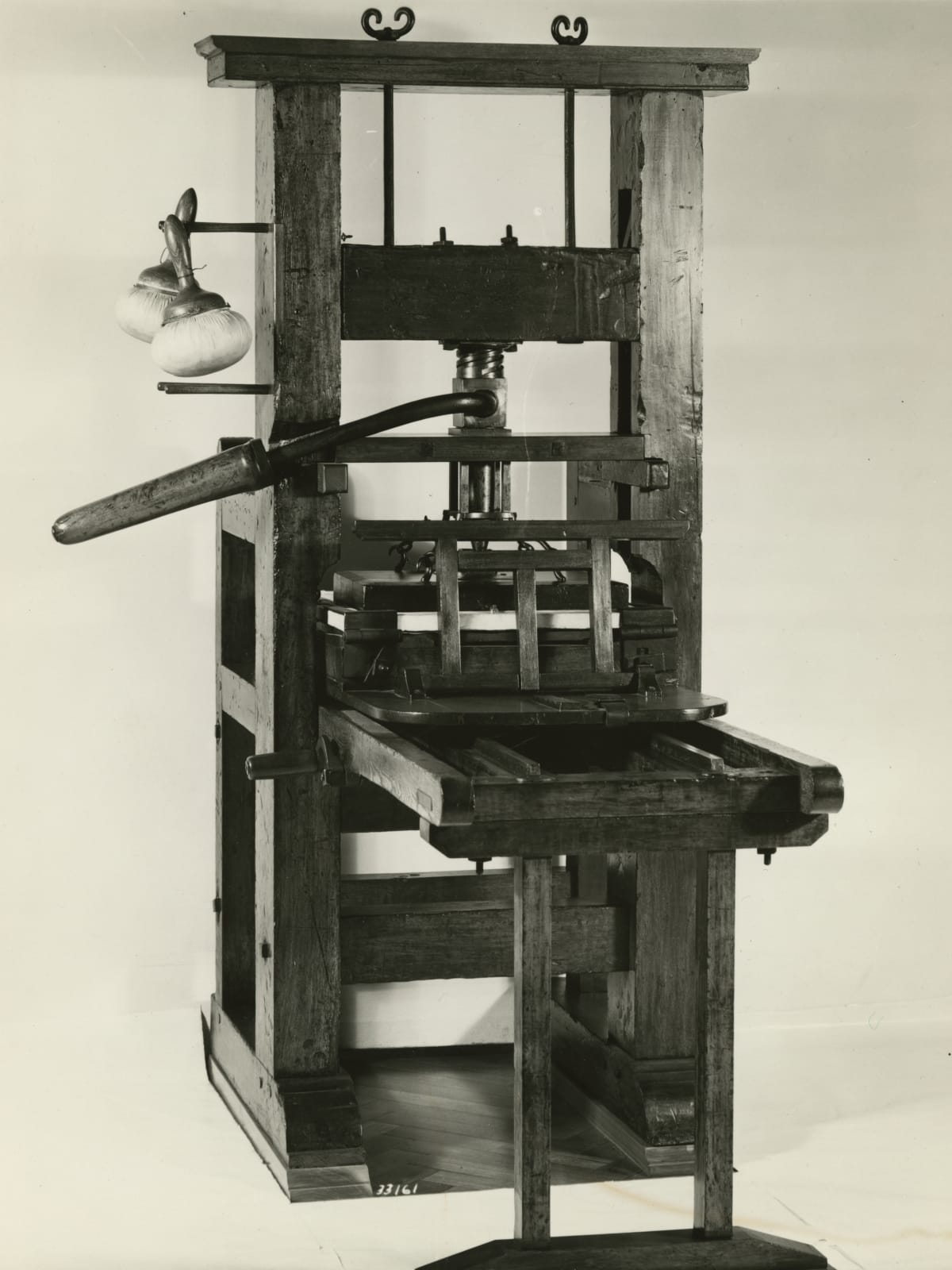 This hand-operated printing press is one of the oldest remaining in the United States. America's premier press maker, Adam Ramage, made it in Philadelphia in about 1809. He was the first American to improve printing presses and began a tradition of American innovations in printing press design. With this press, two journeymen printers printed about 250 one-sided sheets per hour.