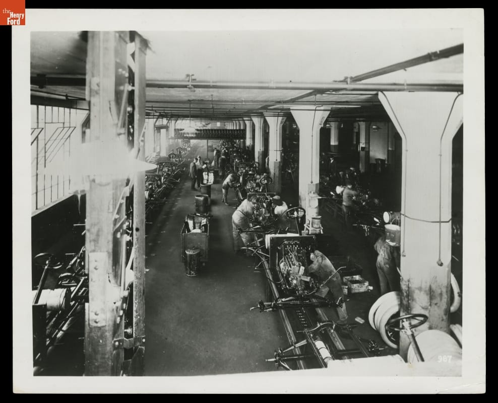 On the chassis assembly lines, frames, axles, gas tanks, engines, dashboards, wheels, radiators, and bodies came together in that order to produce finished, running automobiles. In this view of installing the assembled dashboards, workers connect ignition wires, spark controls, and throttle controls to the engine, and connect the steering column to the tie rods on the front axle. …