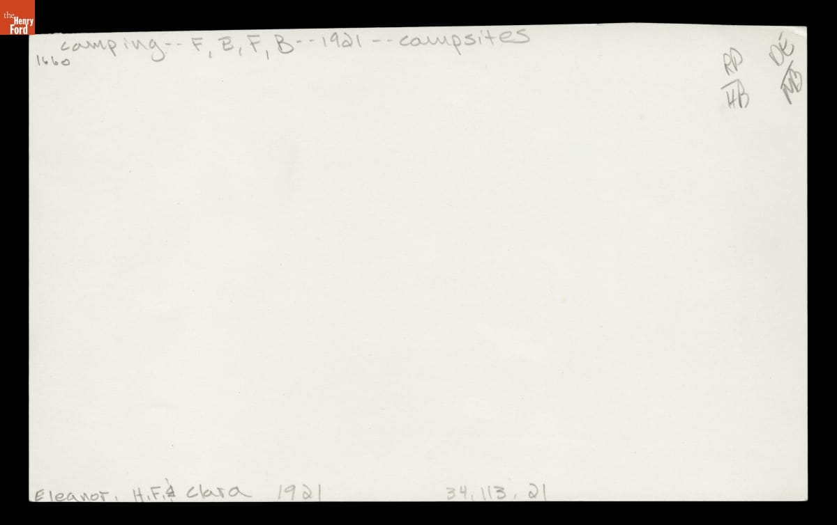 Known as the Vagabonds, Henry Ford, Thomas Edison, Harvey Firestone, and John Burroughs embarked on numerous camping trips between 1916 and 1924. In 1921, the Vagabonds -- minus Burroughs who had passed earlier that year -- welcomed their families along for a special camping trip with President Warren G. Harding. Here, the Ford family takes in the jovial camp atmosphere.