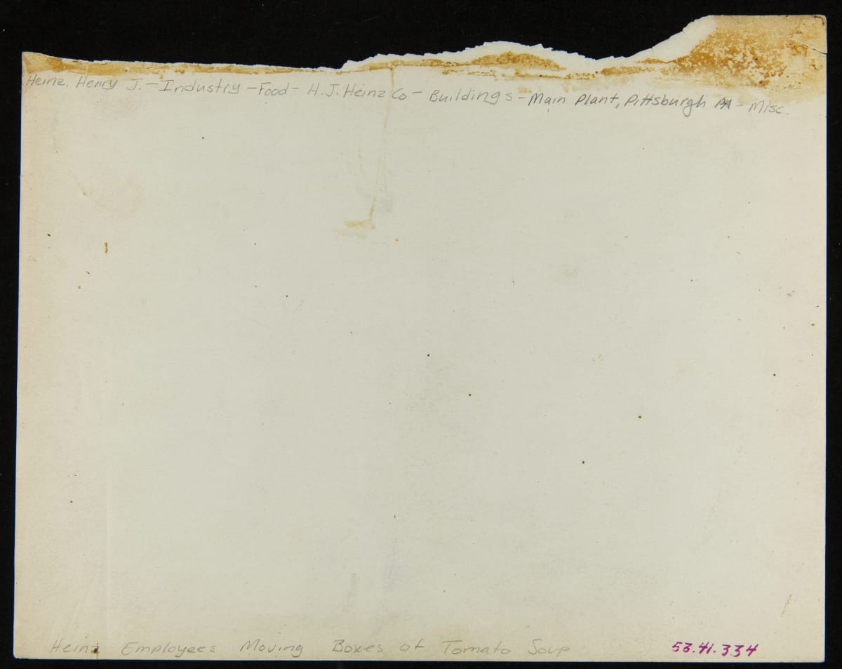 Before complete mechanization of the manufacturing process, many tasks at the Heinz factory were done by hand. The H.J. Heinz Company documented the many departments of the manufacturing process through photographs. This photograph shows an employee moving boxes. These boxes were possibly heading for the shipping dock to be loaded onto a train or truck.