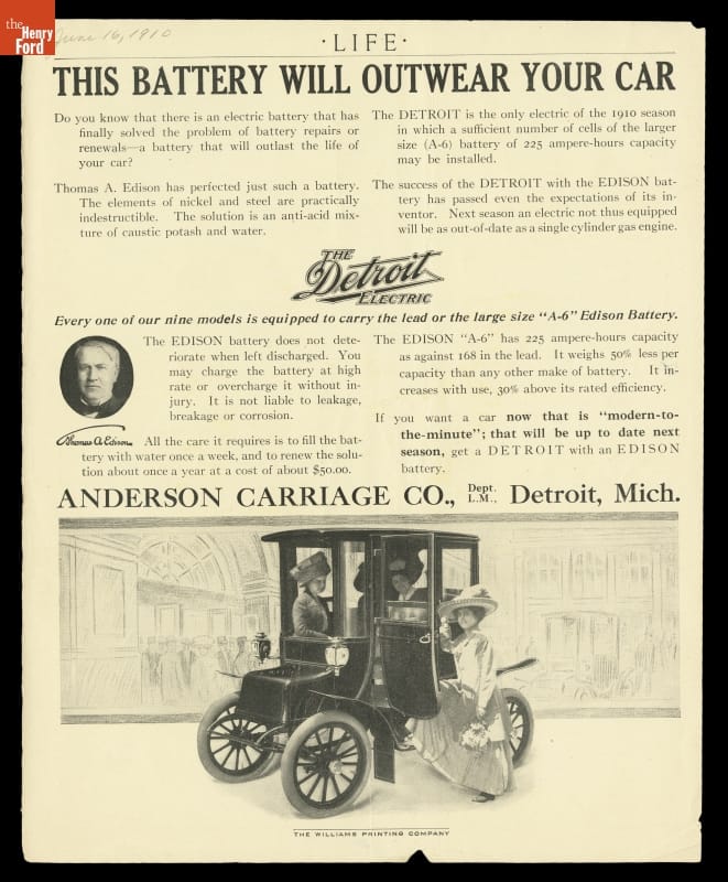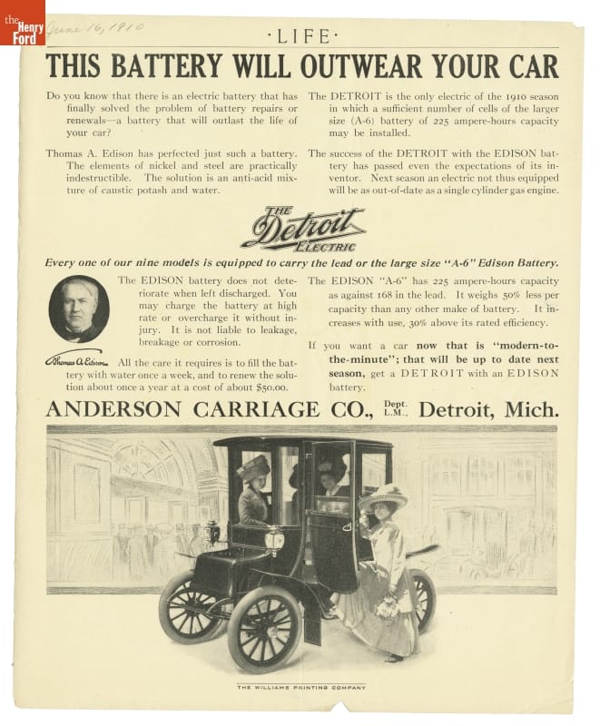 At top of page: LIFE / THIS BATTERY WILL OUTWEAR YOUR CAR / Text reads: Do you know that there is an electric battery that has / finally solved the problem of battery repairs or renewals / --a battery that will outlast the life of your car? Thomas A. Edison has perfected just such a battery. / The elements of nickel and steel are practically / indestructible. The solution is an anti-acid mix / ture of caustic potash and water. The DETROIT is the only electric of the 1910 season / in which a sufficient number of cells of the larger / size (A-6) battery of 225 ampere-hours capacity / may be installed. The success of the DETROIT with the EDISON bat / tery has passed even the expectations of its in / ventor. Next season an electric not thus equipped / will be as out-of-date as a single cylinder gas engine. The Detroit Electric. Every one of our nine models is equipped to carry the lead or the large size "A-6" Edison Battery. The Edison battery does not de / teriorate when left discharged. You may / change the battery at high / rate or overcharge it without injury. It is not liable to leakage, / breakage or corrosion. The EDISON "A-6" has 225 ampere-hours capacity / as against 168 in the lead. It weighs 50% less per / capacity than any other make of battery. It in / creases with use, 30% above its rated efficiency. If you want a car now that is "modern-to- / the-minute"; that will be up to date next / season, get a DETROIT with an EDISON / battery. Condition: Bottom right corner bent.