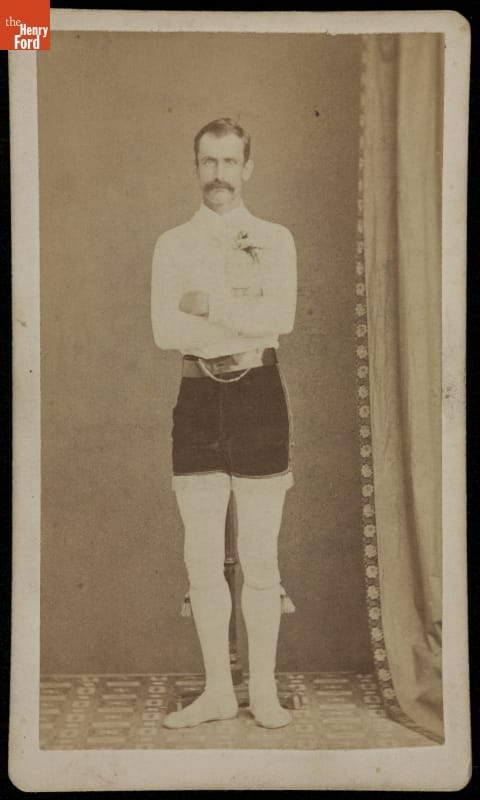This man, identified as Jack Shaw, was a fireman with the Alert Hose Company of Big Rapids, Michigan. To 21st-century eyes his uniform may appear odd, but it was worn during firemen's tournaments and not for fighting fires. These competitions pitted rival firefighting companies against each other in engine and hose races and other tests of firefighting skills needed during fire emergencies.