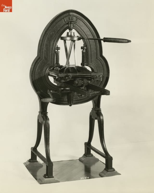 Invented by Abraham O. Stansbury in 1821, this press included an innovative "torsion toggle." When the press bar was turned, three inclined rods straightened, exerting pressure on the platen to make a print impression. The spring-loaded platen returned to its starting position once the print was made.