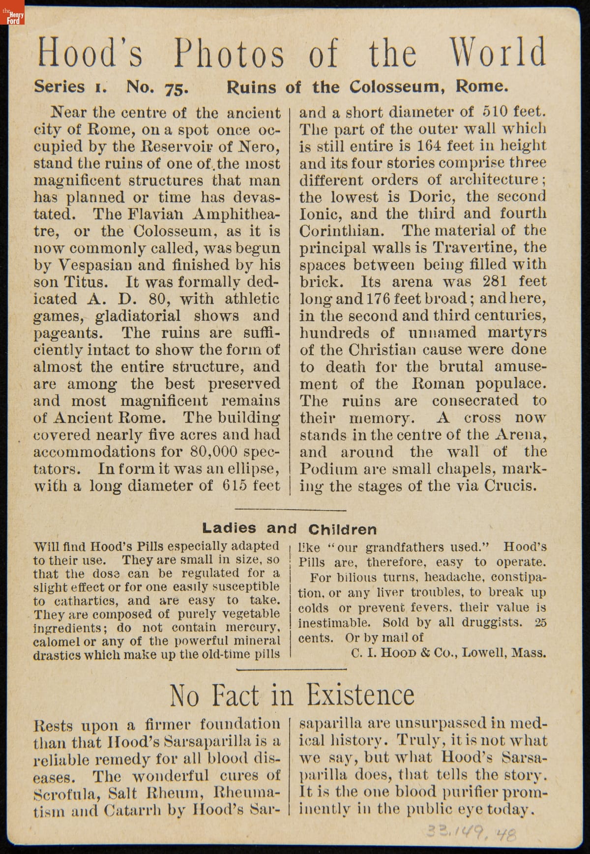 Trade Card for C.I. Hood & Co. with Hood's Photos of the World, "Colosseum, Rome," 1890-1910