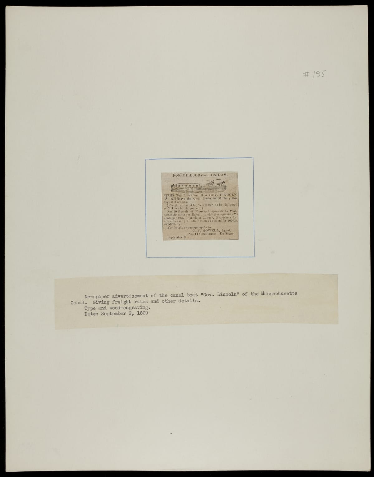 The first half of the 19th century was the heyday of canals in the United States, providing easier access to territories for settlement and commerce. This newspaper advertisement, published September 9, 1829, for the canal boat Gov. Lincoln of the Massachusetts Canal, notified the public of the date and time for departure, along with freight and passage rates.