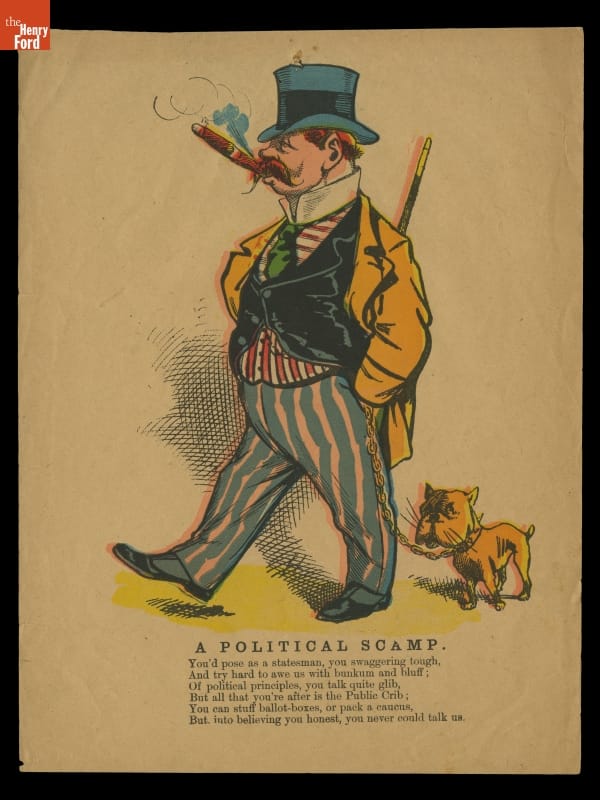 printed on front: A POLITICAL SCAMP. You'd pose as a statesman, you swaggering tough, And try hard to awe us with bunkum and bluff; Of political principles, you talk quite glib, But all that you're after is the Public Crib; You can stuff ballot-boxes, or pack a caucus, But into believing you honest, you never could talk us.