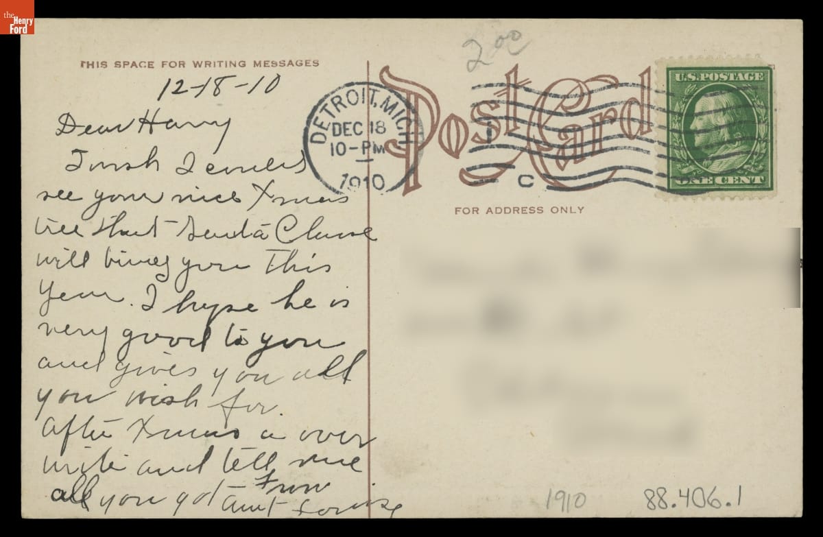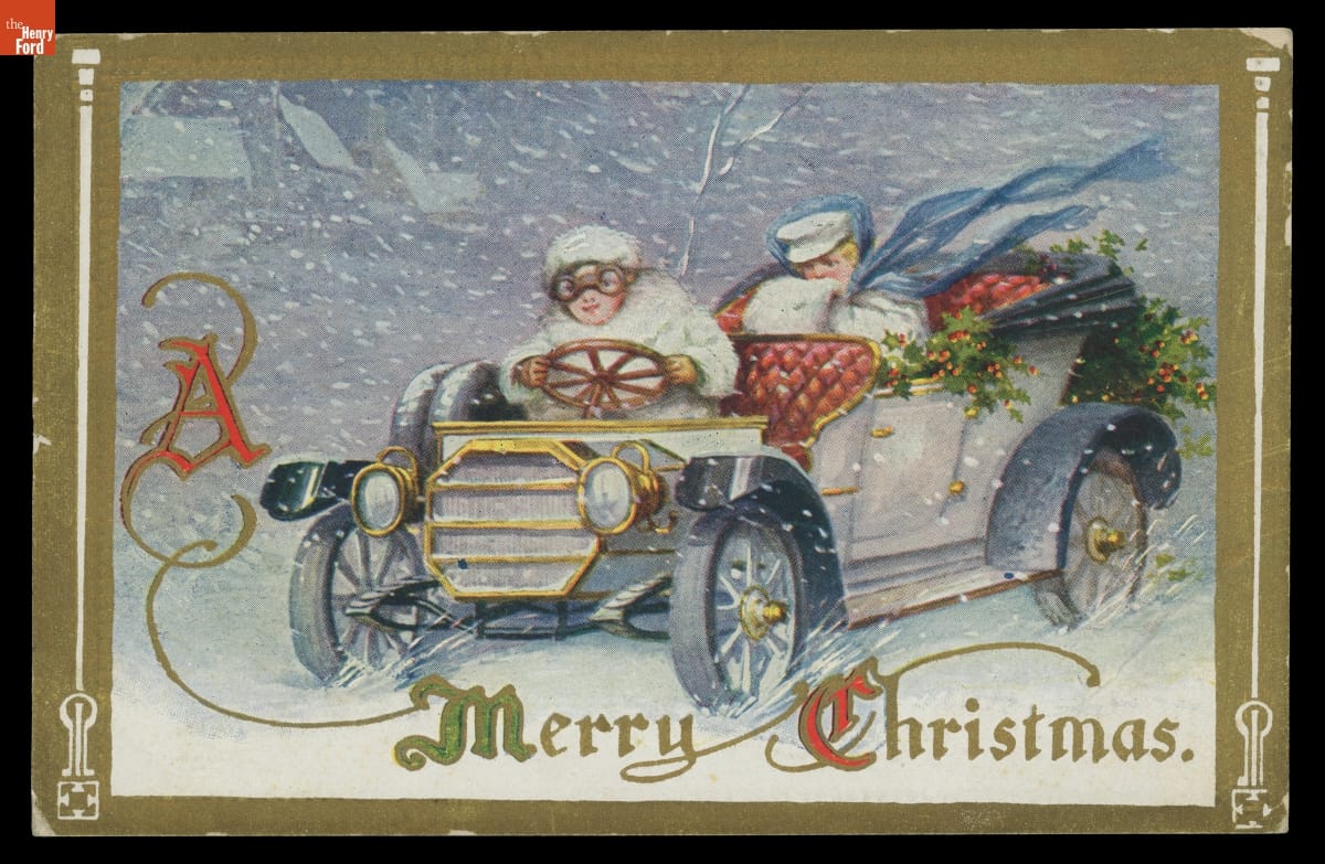 Mailing colorful, commercially designed greeting cards was a 20th-century American tradition. During the holidays, friends and neighbors commonly exchanged cards wishing the recipient a merry Christmas or happy New Year. Sometimes, as with this example, holiday cards combined seasonal decoration with contemporary, non-traditional imagery.