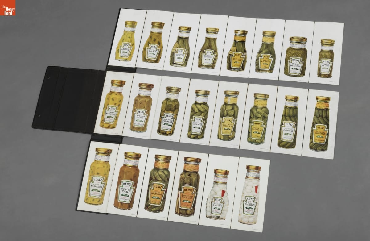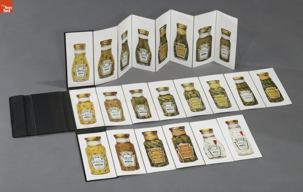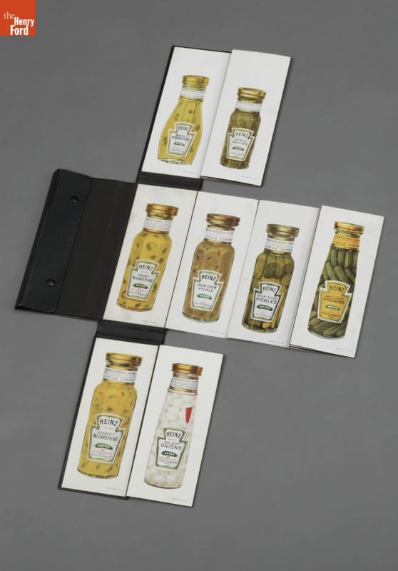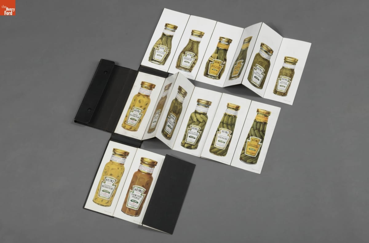 With many varieties of pickles and condiments that the company sold, a Heinz salesperson relied on a kit with fold-out cards to present the products to potential customers. Whether selling to store owners or peddling to residents in their homes, the kit allowed salespeople to show a variety of products without physically carrying them.