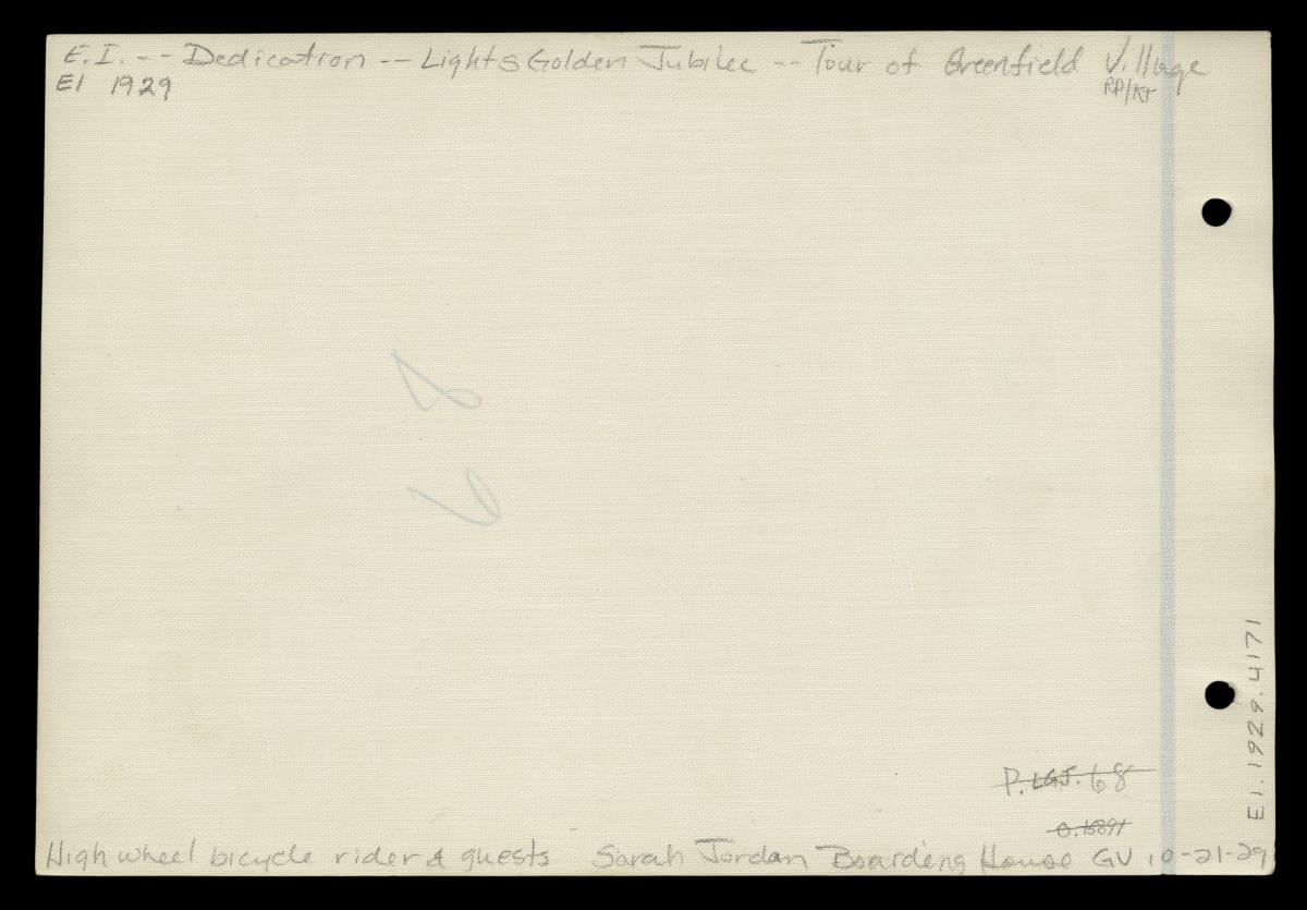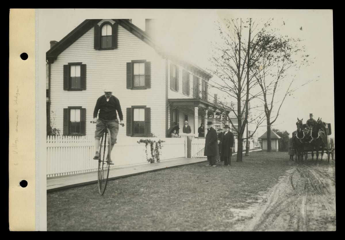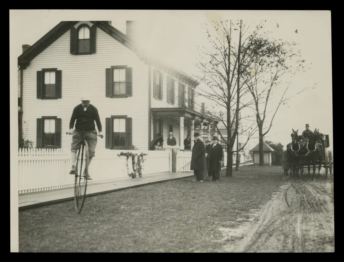 Guests Watch a High-wheel Bicycle Rider outside the Sarah Jordan Boarding House during a Tour of Greenfield Village, October 21, 1929