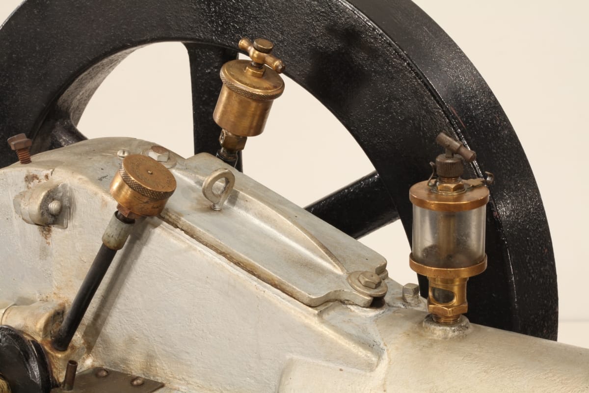 Cast into valve cover plate: Olds / Patent 8 / 1704 Cast into cylinder head: Motor / (4 illegible characters below) Printed on spark plug: Champion Engraved on brass oiler (flywheel side): LEFT HAND / THE LUNKENHEIMER CO. CIN. O. IDEAL NO. 0 Engraved on brass oiler (across from flywheel): THE LUNKENHEIMER CO. CIN. O. TIGER NO. 0 / PATENTED SEP. 3. 1889 - FEB. 21 1893