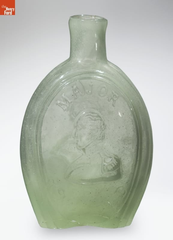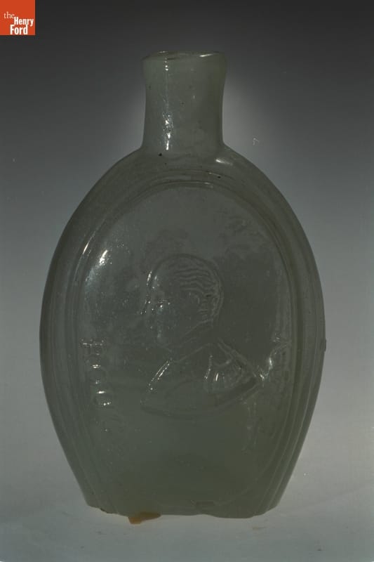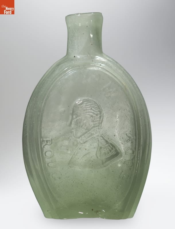 Glass factories in America began producing inexpensive, mold-formed flasks in the early 1800s. These figured flasks, often decorated with symbols of national pride, appealed to America's common man. This flask contains images of two American heroes of the Mexican War -- General Zachary Taylor ("Rough and Ready") and Major Samuel Ringgold, one of the first casualties of the war.