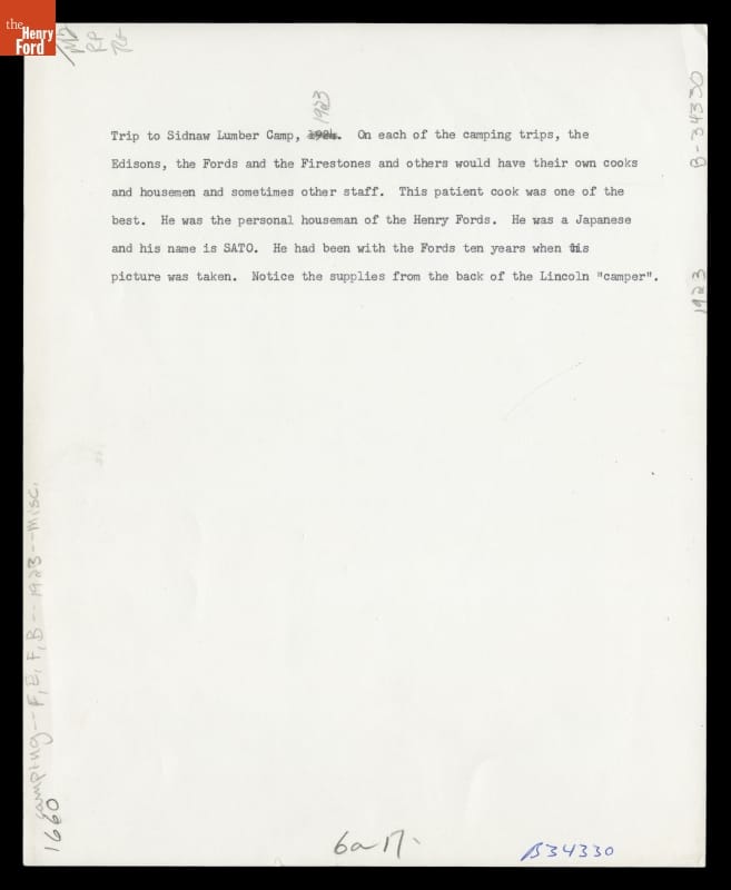 Between 1916 and 1924, Henry Ford, Thomas Edison, Harvey Firestone and John Burroughs embarked on a series of camping trips. They called themselves the Vagabonds, but they camped in style. Numerous support staff set up and took down camp, cooked, took photographs, and maintained the cars and equipment trucks. Thomas Sato, an employee at Ford's Fair Lane estate, prepared meals for the Vagabonds and staff in 1923.