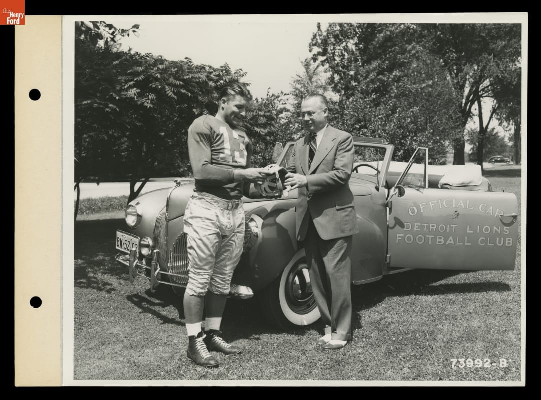 Football fans could thank Dearborn, Michigan, Ford dealers for presenting radio broadcasts of the 1940 Detroit Lions' season. Fans could tune into WJR each week to hear the play-by-play. In addition, dealers sponsored an August preseason show that featured news from the Lions' training camp and interviews with players. Photographs, like this one, helped promote local dealers and the Lions' games.
