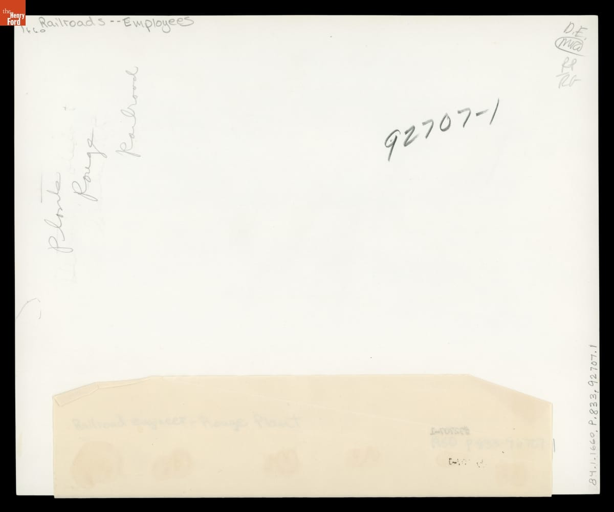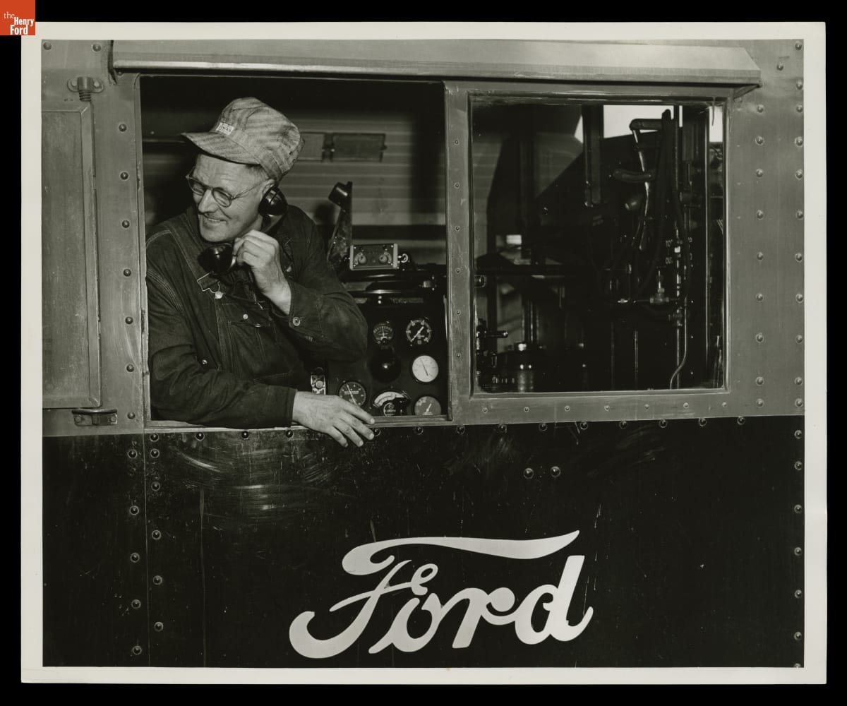 Engineer Ole Garras Receiving Switching Orders by Radio/Telephone, Ford Motor Company Rouge Plant Railroad Yard, August 1950