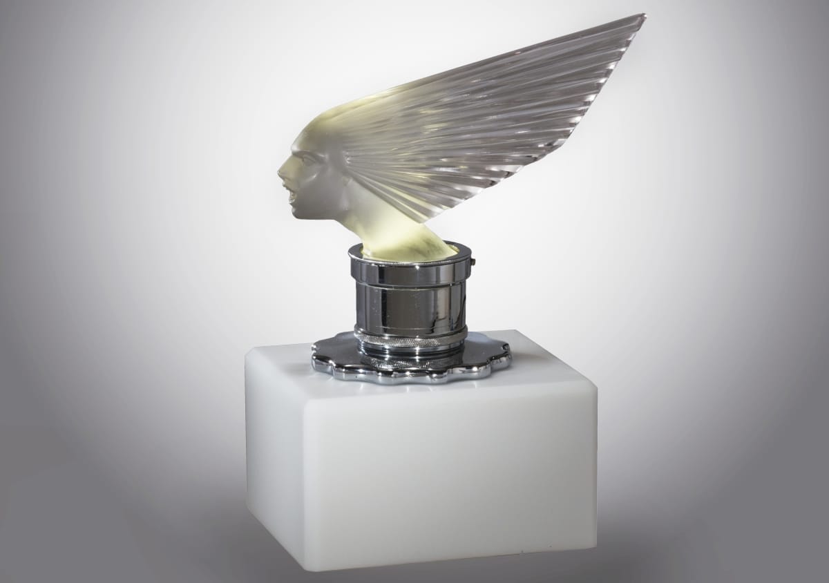 Rene Lalique created some of the most striking automobile mascots or hood ornaments. Lalique's elegant, molded-glass models enhanced the front of any luxury vehicle. The mascots could also be lit from below making them all the more impressive. These decorative mascots became a symbol of the car owner's wealth, status, and good taste.