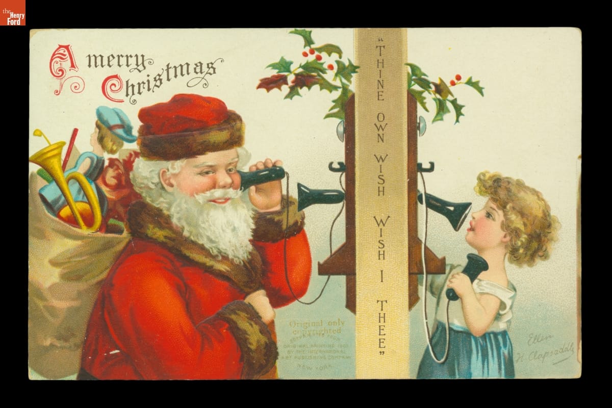 By 1907, the date of this postcard, telephones were part of everyday life in America. The artist imagined children using this invention to talk with Santa. Today, innovative children can use other inventions, such as computers, to communicate with jolly old St. Nick.