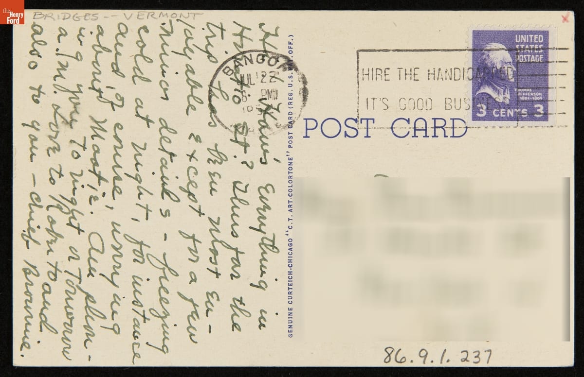 "Covered Bridge, West Brattleboro, Vt., in the Green Mountains," July 1952