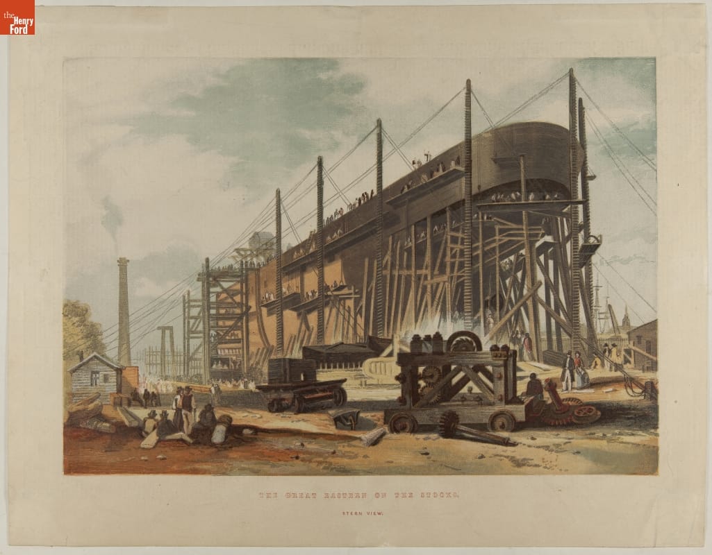 Chromolithograph, "The Great Eastern on the Stocks during Construction, Stern View," 1857