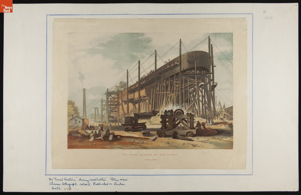 printed on front: THE GREAT EASTERN ON THE STOCKS / STERN VIEW handwritten on front: The "Great Eastern" during construction. Stern View. / Chromo-lithograph, colored. Published in London. / Date 1857