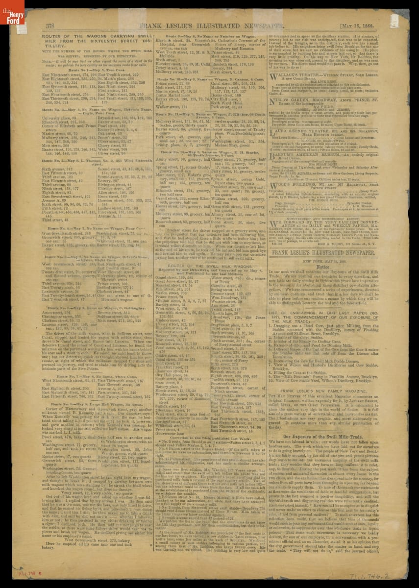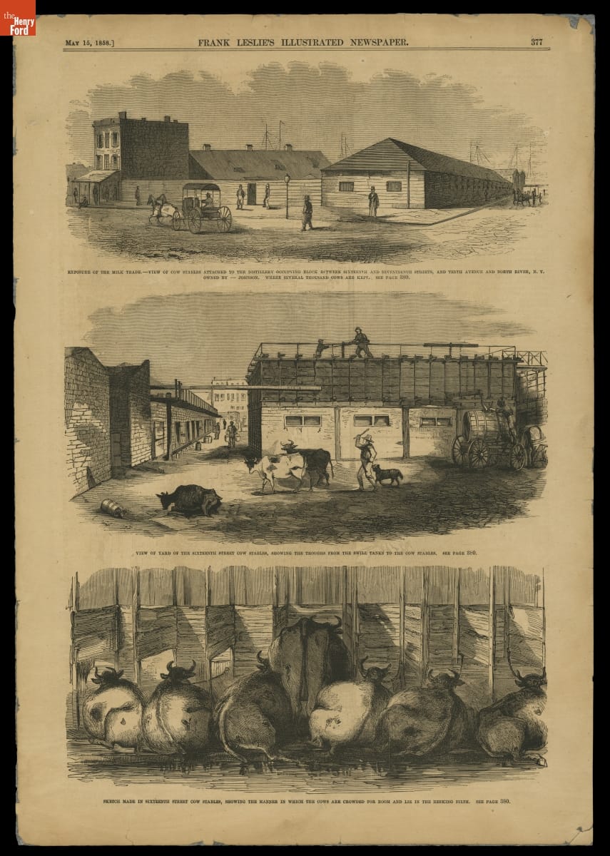 Frank Leslie's scathing articles exposed New York City's "swill milk" scandal in 1858. Whiskey distillers had been keeping dairy cows in cramped sheds and feeding them leftover mash, sickening them and tainting their milk. In turn, the milk--masked with other ingredients and marketed as "pure" to urban consumers--poisoned thousands of infants. New York State finally issued milk regulations in 1862.