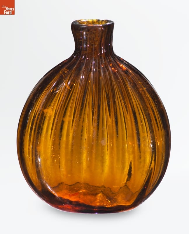 American glass factories produced flasks, like this one, from the late 1700s well into the mid-1800s. The pint-sized flask could hold water but more likely contained alcoholic beverages. Its textured decorative exterior -- formed when the hot glass was dipped into a pattern mold before it was blown -- made the flask easier to grasp. And its flattened shape fit nicely into pockets providing ready access to the liquid refreshment.