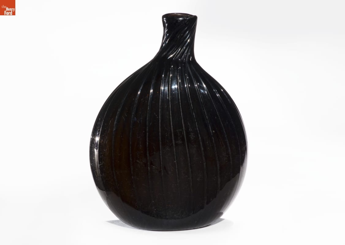 American glass factories produced flasks, like this one, from the late 1700s well into the mid-1800s. The pint-sized flask could hold water but more likely contained alcoholic beverages. Its textured decorative exterior -- formed when the hot glass was dipped into a pattern mold before it was blown -- made the flask easier to grasp. And its flattened shape fit nicely into pockets providing ready access to the liquid refreshment.