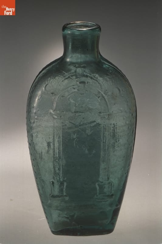 Glass factories in America began producing inexpensive, mold-formed flasks in the early 1800s. These figured flasks, often decorated with symbols of national pride or political or cultural affiliation, appealed to America's common man. Membership in the Freemasons grew in the early decades of the 1800s. Supporters of the Masonic order would recognize the ritualistic symbols on this and other similar flasks.