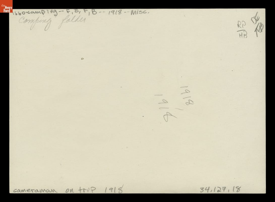 Thomas Sato carries a camera during the 1918 camping trip through the Mid-Atlantic Appalachian Mountains by the "Vagabonds" -- Henry Ford, Thomas Edison, Harvey Firestone, and John Burroughs. Sato was Ford's personal chef, and his elaborate meals were popular with the campers. He prepared chicken, beef, pies, cookies, and more with a camp truck converted into a mobile kitchen.
